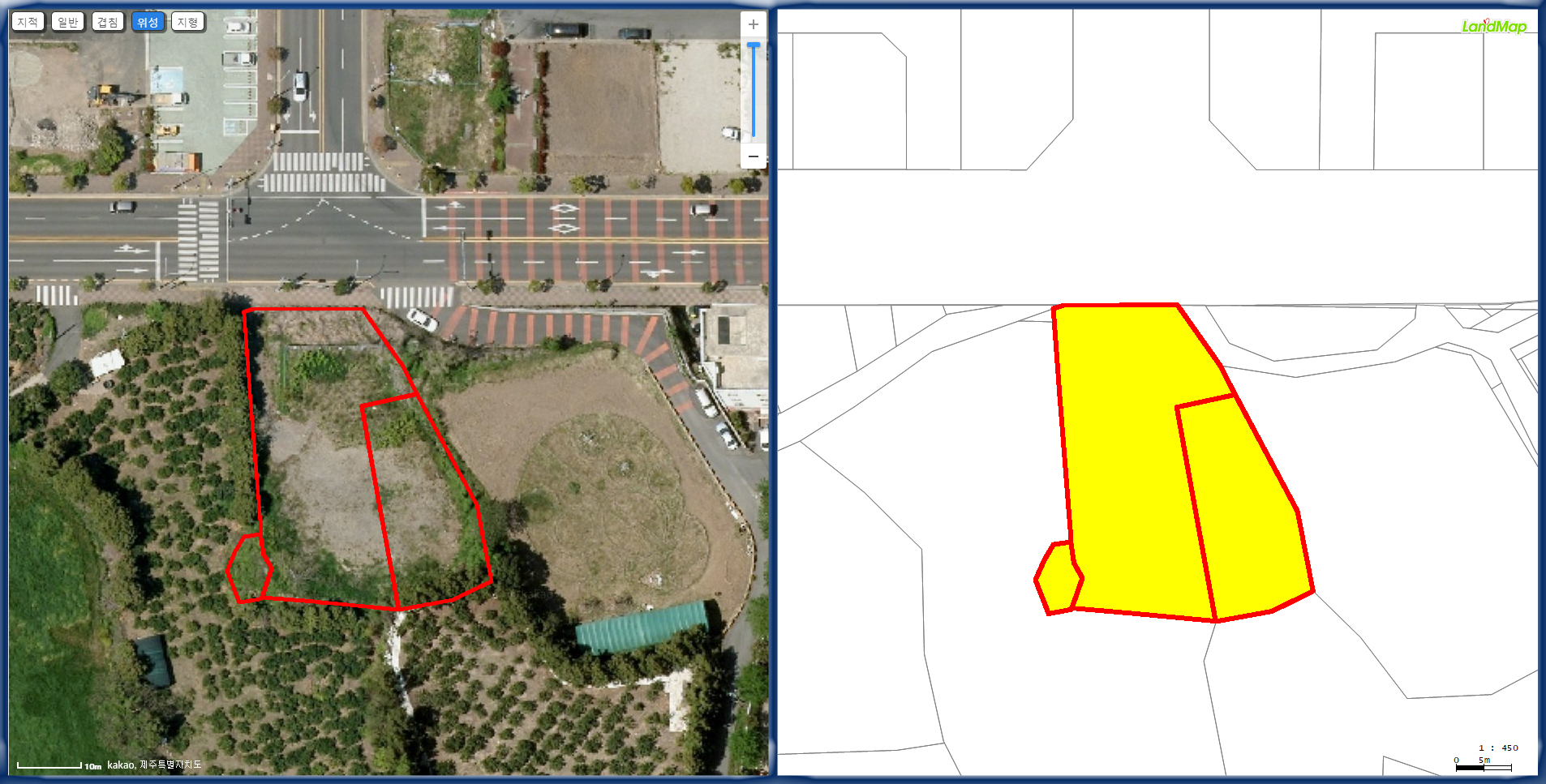 그리고 우리땅이 접해 있는 이 도로가 주거지역과 녹지지역의 경계야.
