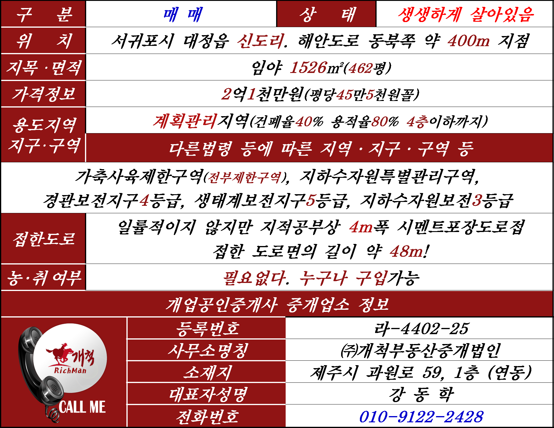 특히 서귀포 바닷가 인근에 영구조망에 요런 가격에 면적에 기반시설에….