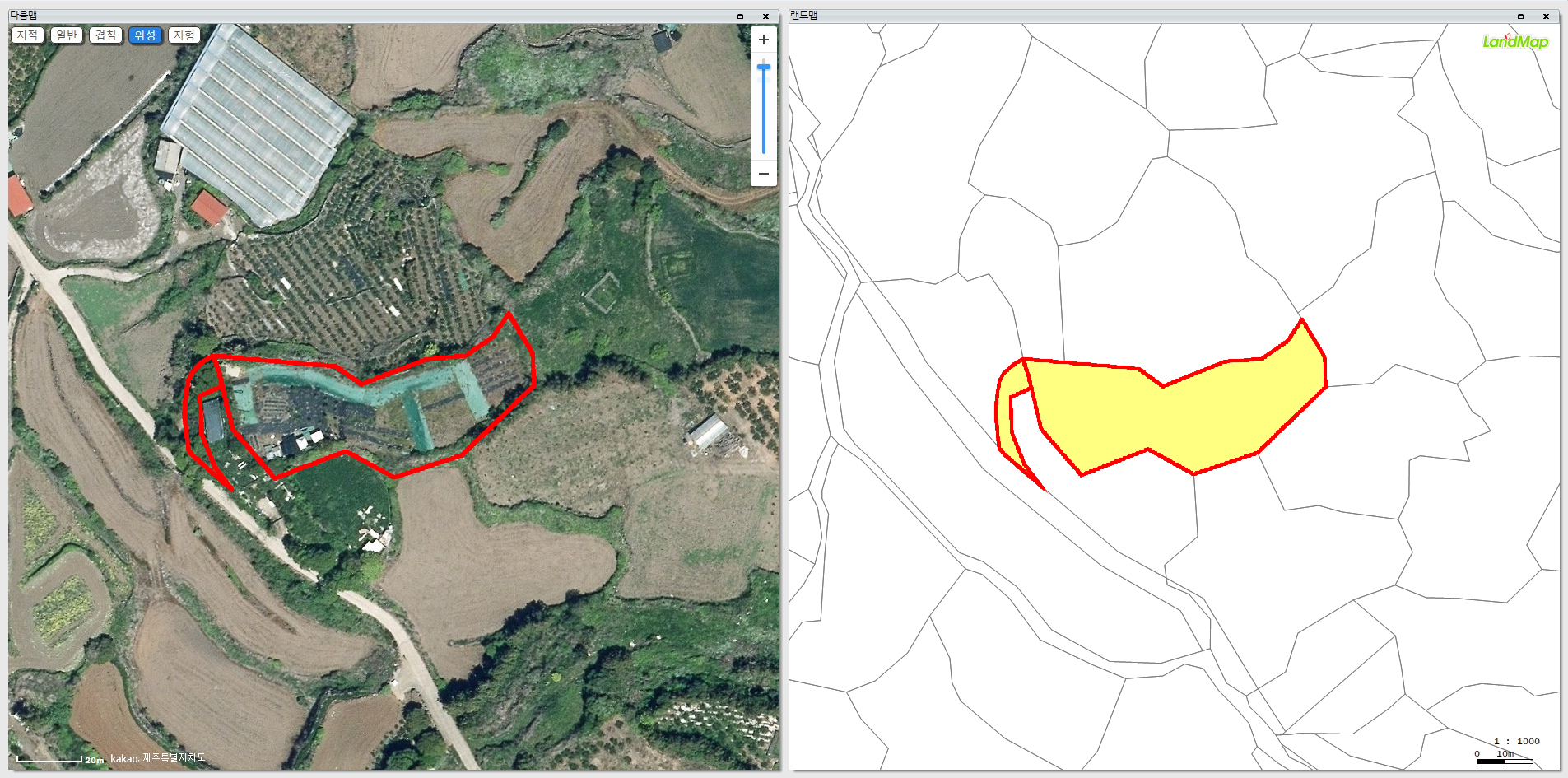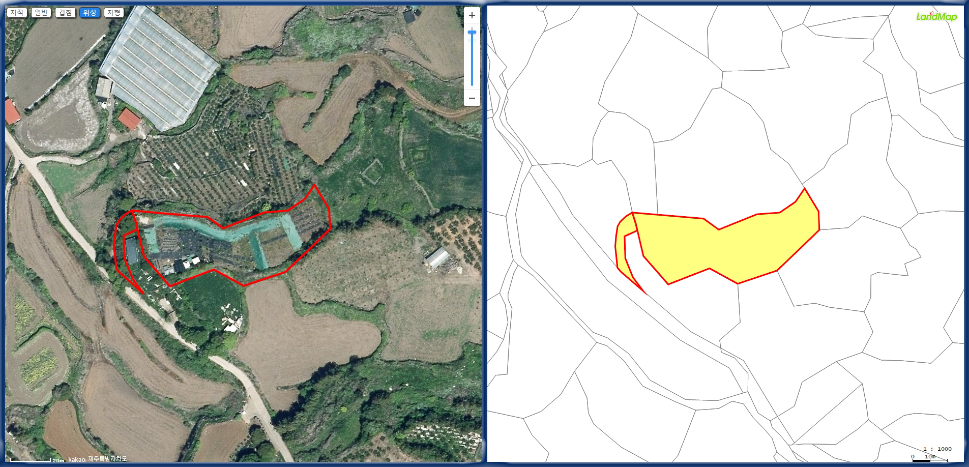 모두 2개 필지로 구성이 되어 있는데, 두 개 필지 모두 지목은 ‘전’이고