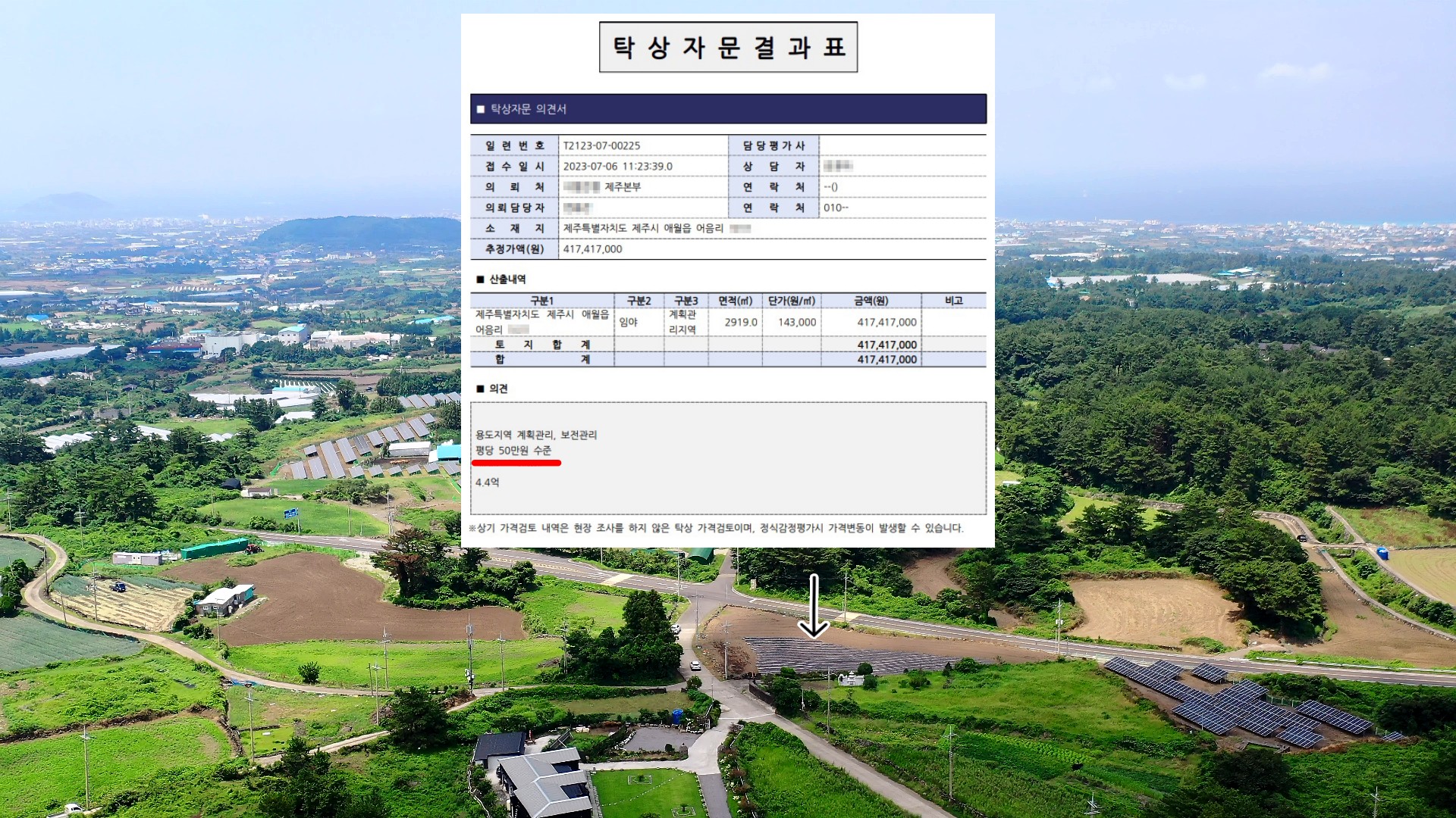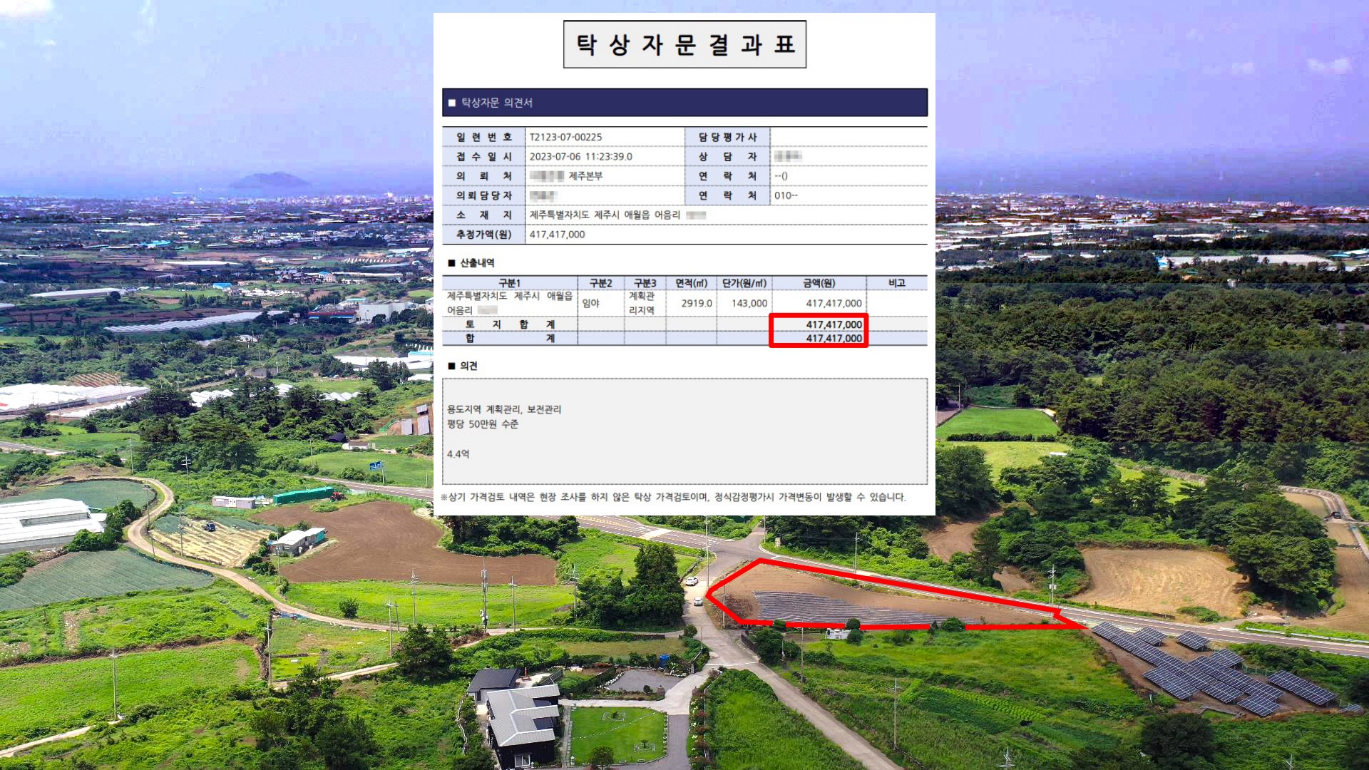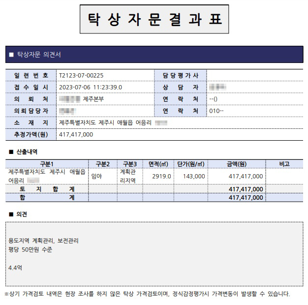 바로 금융기관에서 감정평가기관에 담보물에 대한 탁상감정을 의뢰한 결과표인데.