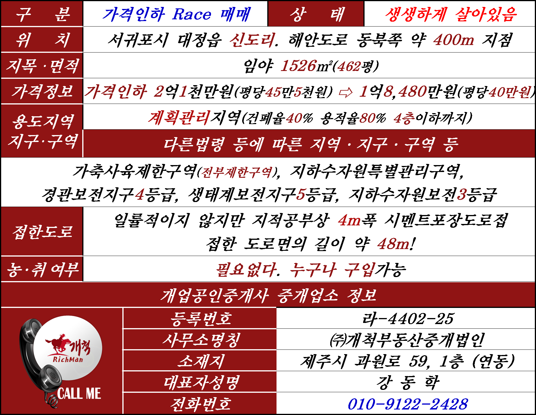 믿을 수 없는 가격으로 서귀포시 대정읍 신도리까지 개척하는 거 맞지? ^^