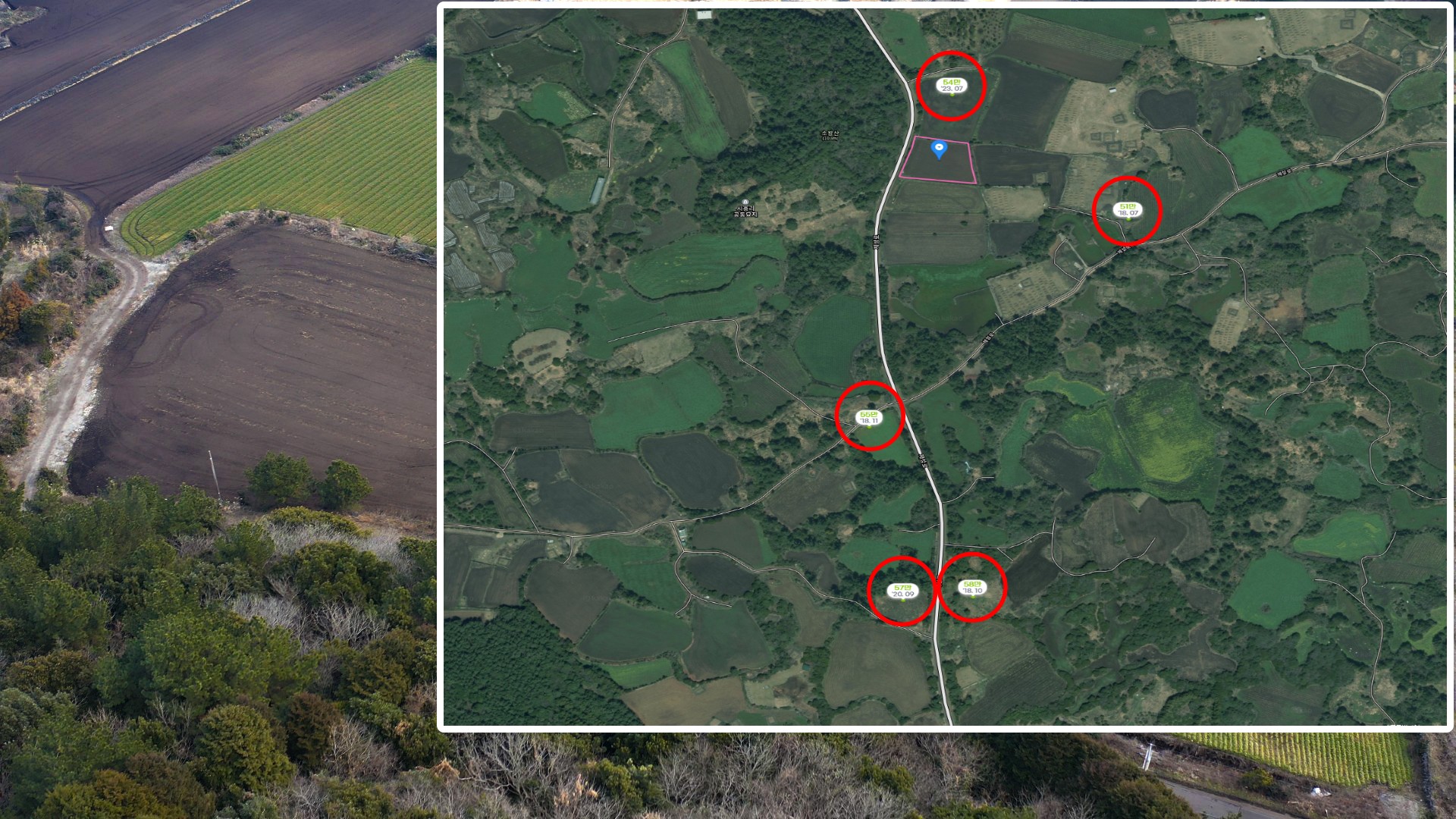 더 남쪽으로 같은 2차선도로 접해 있는 왼쪽 땅이 20년 9월달에 평당 57만원,