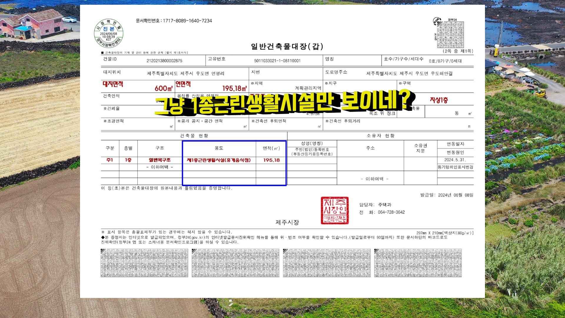 어라? 건축물대장엔 주택이 없고 1종근린생활시설로만 되어 있네?!